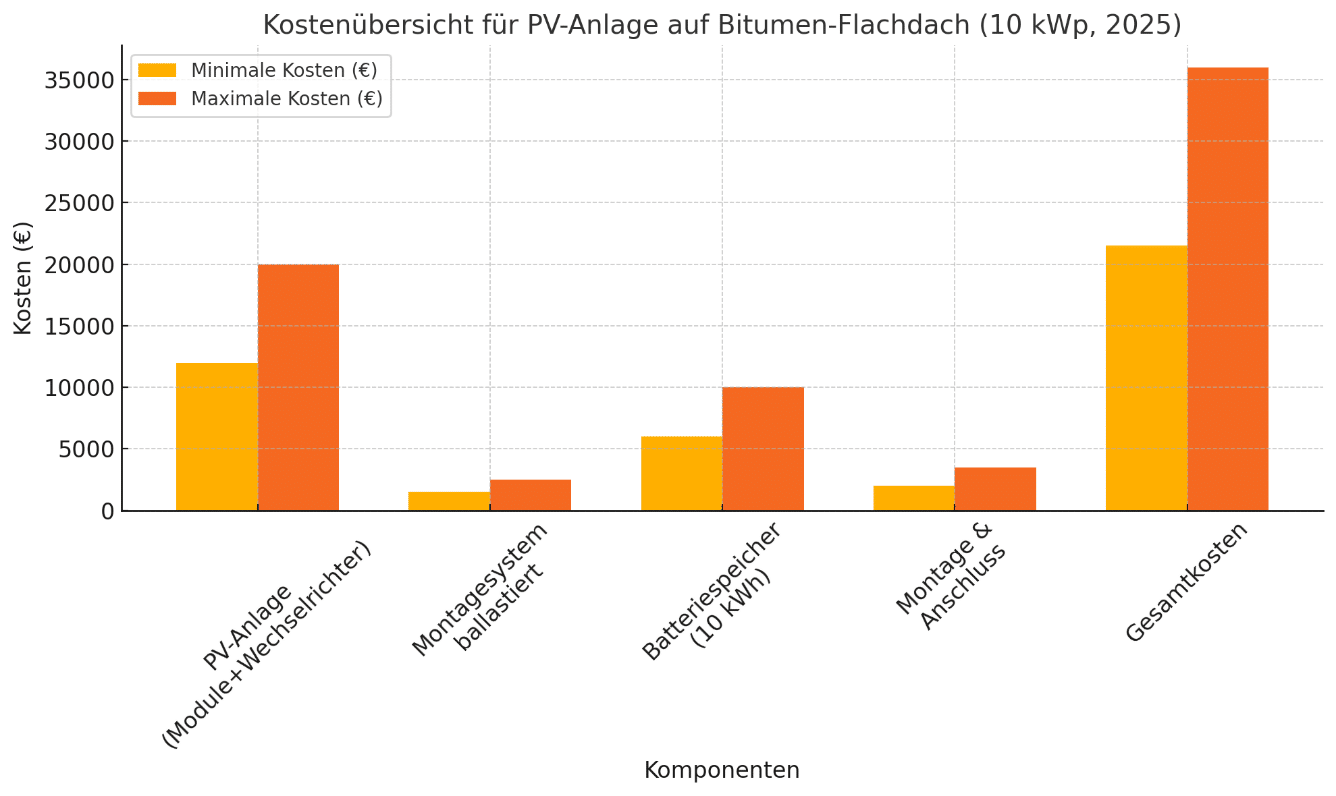 | Ballastiertes Montagesystem (Flachdach) | 1.500–2.500 € (ca. 150–250 €/kWp) |