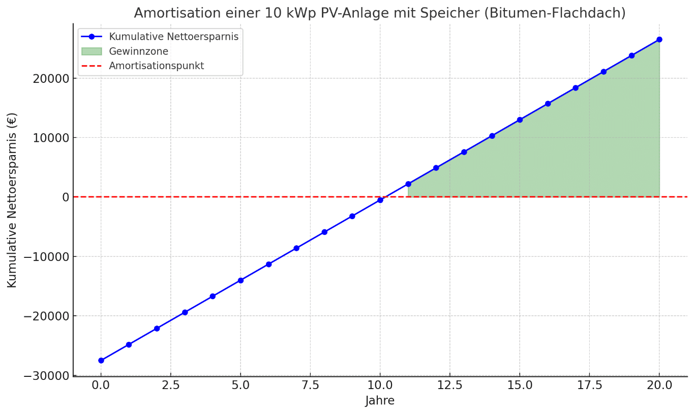Eine PV-Anlage auf deinem Bitumen-Flachdach bietet dir 2025 ein attraktives Preis-Leistungs-Verhältnis. Dank optimaler Ausrichtungsmöglichkeiten und effizienter Speichertechnik amortisiert sich die Anlage meist innerhalb von etwa 8 bis 12 Jahren. Langfristig profitierst du von einer Gesamtersparnis von ca. 30.000 bis 35.000 € und wirst unabhängiger von steigenden Strompreisen.