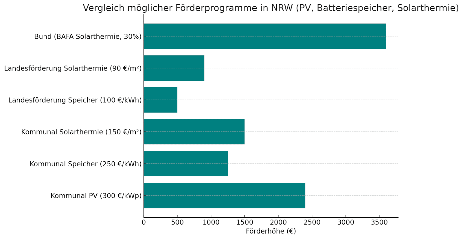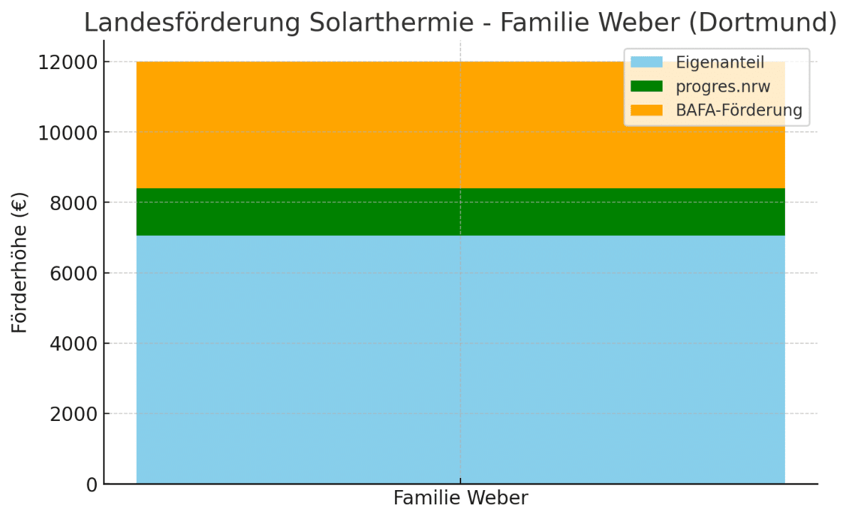 Praxisbeispiel Landesförderung: Familie Weber aus Dortmund installiert eine Solarthermieanlage (15 m²) für Warmwasser und Heizungsunterstützung. Die Gesamtkosten belaufen sich auf 12.000 €. Durch progres.nrw erhält sie einen Zuschuss von 1.350 € (90 €/m²). Zudem bekommt sie vom BAFA weitere 3.600 € (30 %). Insgesamt spart Familie Weber so 4.950 € an Investitionskosten.