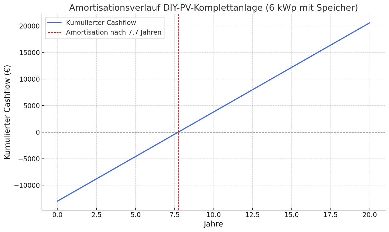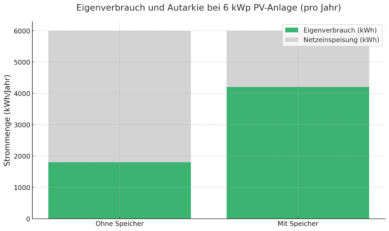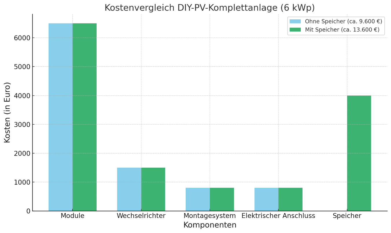 | Gesamtkosten (6 kWp + 6 kWh Speicher) | ca. 12.300–15.700 Euro |