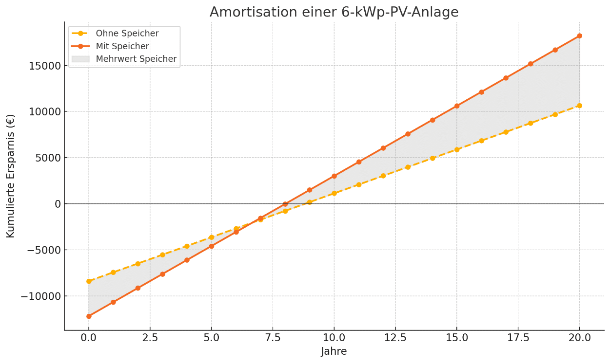 | Preis (6 kWp inkl. Speicher & Montage) | ca. 13.500–14.000 € |