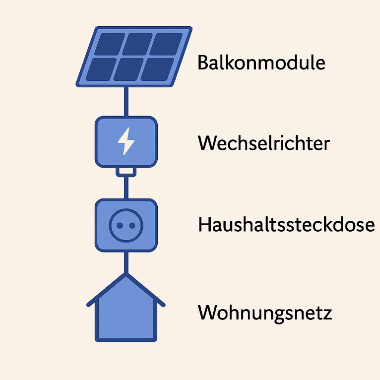 Deine Balkon-Solaranlage, oft auch als Balkonkraftwerk bezeichnet, funktioniert unkompliziert und effizient: Die Solarmodule wandeln das Sonnenlicht direkt in elektrischen Strom um. Dieser erzeugte Gleichstrom wird über einen kleinen Mikro-Wechselrichter in haushaltsüblichen Wechselstrom umgewandelt. Anschließend speist du den erzeugten Strom ganz einfach über eine herkömmliche Haushaltssteckdose direkt in dein Wohnungsstromnetz ein. Du benötigst keine zusätzlichen Elektroinstallationen und keine speziellen Fachkenntnisse.