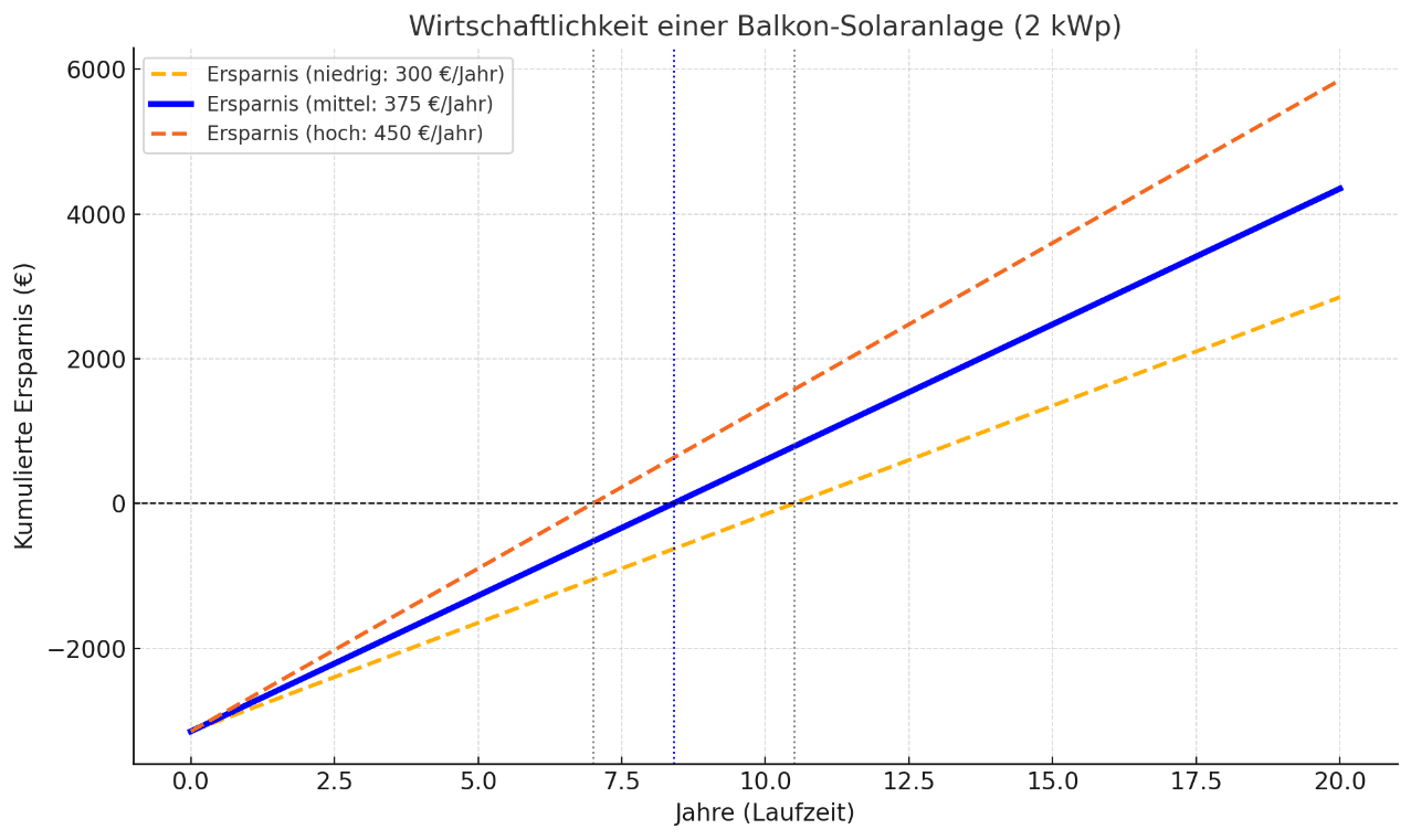 - Jährliche Einsparungen: Du kannst jährlich etwa 300 bis 450 Euro Stromkosten sparen, je nach Eigenverbrauch.