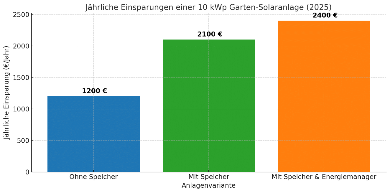 - Typische Kosten: Eine Garten-Solaranlage kostet 2025 etwa 1.400 € pro installiertem kWp ohne Speicher. Mit Batteriespeicher und Montage liegst du bei rund 1.700 € pro kWp plus pauschal etwa 2.000 € für Speichertechnik und Installation.