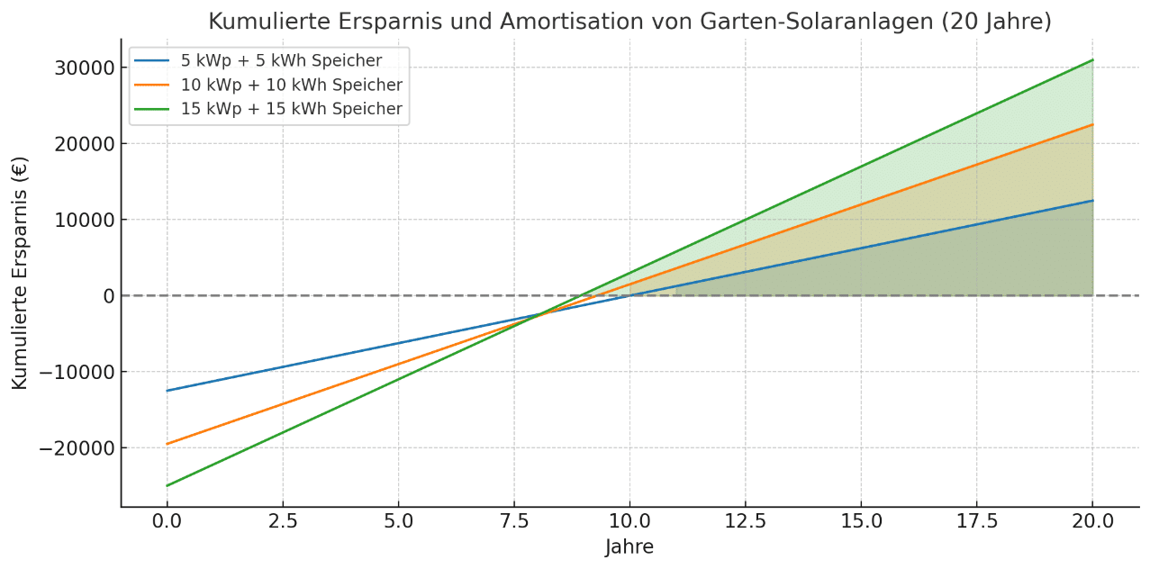 Ja, eine Garten-Solaranlage amortisiert sich typischerweise bereits nach etwa 9 bis 11 Jahren. Danach sparst du langfristig Stromkosten und erzielst attraktive Gesamtersparnisse.