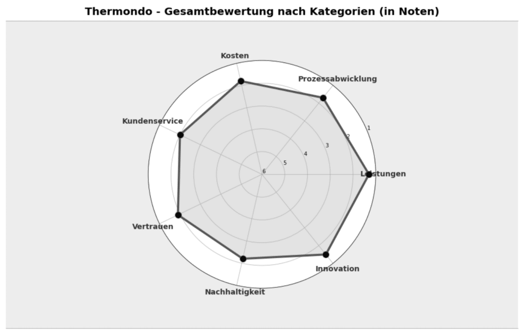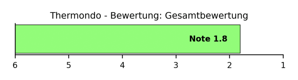 Insgesamt erhält Thermondo eine starke Gesamtnote von 1,8. Damit gehört Thermondo eindeutig zu den empfehlenswerten Anbietern auf dem deutschen Markt für nachhaltige und autarke Energielösungen. Kunden, die eine Kombination aus moderner Technologie, transparenter Preisgestaltung und umfassendem Service schätzen, treffen mit Thermondo eine solide und zukunftsweisende Wahl. Gleichzeitig sollten sie jedoch Vertragsbedingungen sorgfältig prüfen und eine gelegentlich eingeschränkte Serviceverfügbarkeit einkalkulieren.