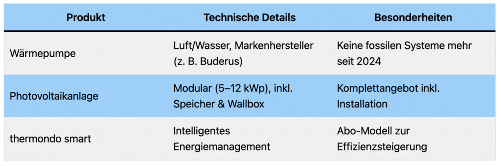 Thermondo bietet umfassende und moderne Energielösungen mit klarem Fokus auf Nachhaltigkeit und Klimaneutralität. Das Kernangebot umfasst Luft/Wasser-Wärmepumpen, die individuell dimensioniert und mit Markenqualität (z. B. Buderus, LG, Vaillant) installiert werden. Ergänzt wird dieses Angebot seit 2024 durch Photovoltaikanlagen inklusive Batteriespeicher und Wallboxen, was Thermondo zum ganzheitlichen Anbieter im Bereich erneuerbarer Energien macht. Ein besonders kundenfreundliches Produkt ist der thermondo smart Energiemanager, der den Eigenverbrauch optimiert und so Heizkosten weiter reduziert. Kunden können zwischen Direktkauf, attraktiven Finanzierungen und einem praktischen Mietmodell („thermondo easy“) wählen, bei dem Thermondo Wartung und Versicherung komplett übernimmt.