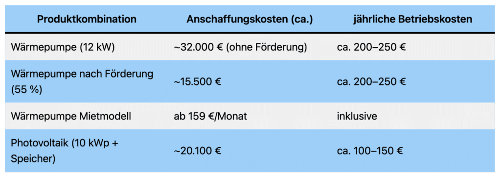 Die Anschaffungskosten für Heizsysteme bei Thermondo variieren stark je nach Technik und individuellem Projektumfang. Eine typische Luft/Wasser-Wärmepumpe kostet inklusive Installation zwischen 27.000 und 40.000 € brutto. Dank staatlicher Förderungen (z. B. BAFA-Zuschuss bis zu 40 %, teils sogar bis zu 70 %) reduzieren sich die realen Kosten erheblich – in optimalen Fällen auf rund 9.000 € bis 11.000 €. Alternativ bietet Thermondo mit dem Mietmodell („thermondo easy“) eine attraktive verbrauchsabhängige Lösung ab 159 € monatlich, in der alle Wartungs- und Reparaturkosten bereits inkludiert sind. Ergänzend kosten Photovoltaikanlagen (ca. 10 kWp inkl. Batteriespeicher) etwa 20.100 €. Jährliche Betriebskosten für Wartung und Service liegen meist zwischen 150–250 €.